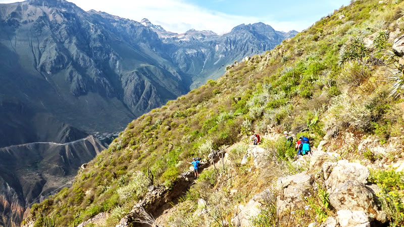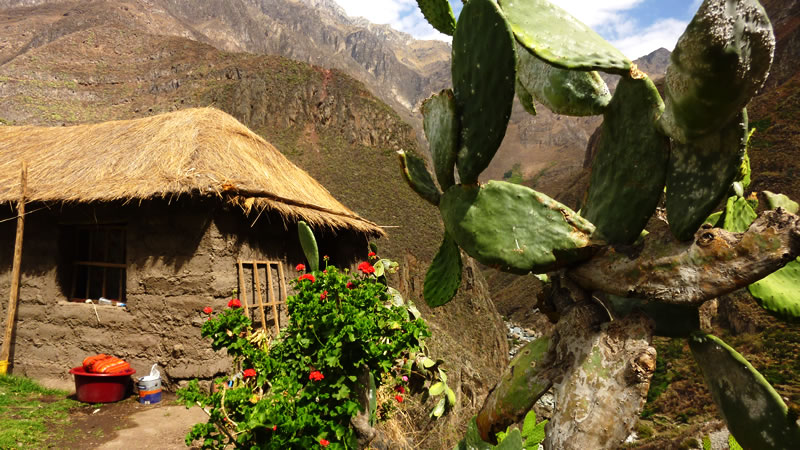 13:00 p.m. Descenderemos el Cañón caminando por 03 horas y media Hrs, para llegar al río Colca, donde podremos descansar. Luego continuará la caminata cruzando el primer puente colgante de la zona y arribar al primer poblado (San Juan de Chuccho), donde descansaremos en casas de tipo Bungalows de los pobladores locales mientras el guía se encarga de la alimentación de grupo. Pernocte.