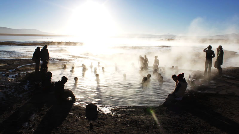 El tercer día partiremos muy temprano, nuestro tour empieza a las 5:00 a. m. para poder apreciar los Geisers – fumarolas en la zona volcánica, más conocida como «Sol de Mañana» luego continuaremos a los baños termales de Polques, allí desayunaremos para luego continuar a las Lagunas Blanca y Verde, ubicadas a los pies del volcán Licancabur, a una altura de 4 350 m.s.n.m. el color verde se debe al alto contenido de magnesio que poseen las formaciones geológicas del área.